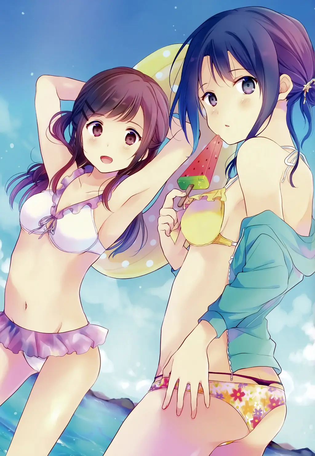 바다에서 수영복 차림인 아다치와 시마무라.